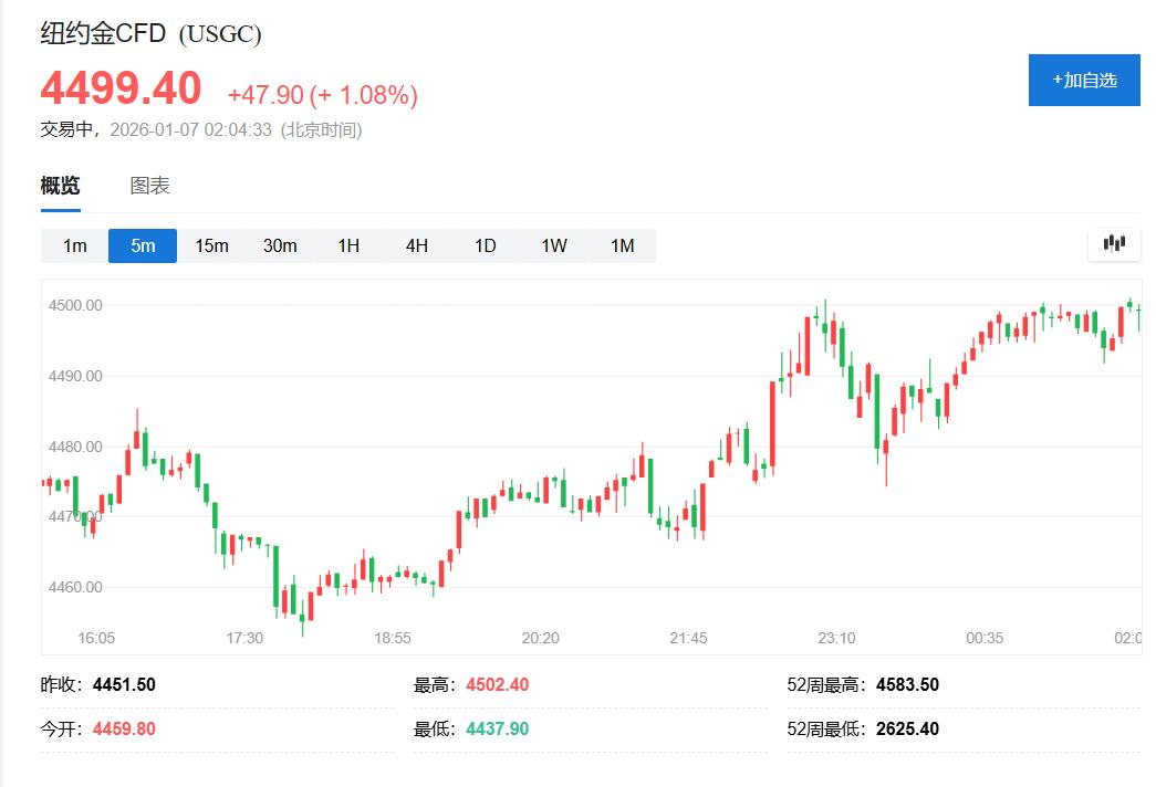 纽约黄金期货周二美股早盘涨破4500美元,日内涨逾1.1%,现货黄金涨至4490美元上方,日内涨近1%,均刷新上周一以来高位。金价2025年累涨超60%,创1979年以来最佳年度表现。