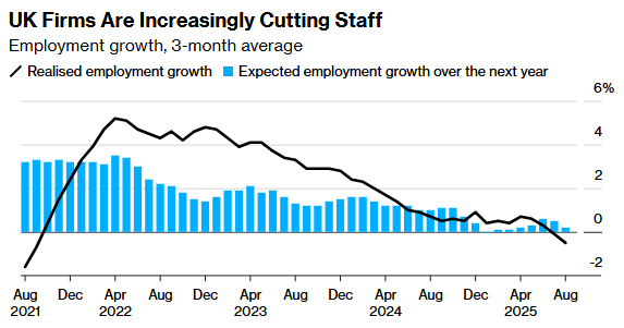 据英国央行的一项调查显示,英国企业今年夏季裁员速度为四年来最快。该调查表明,英国财政大臣雷切尔·里夫斯首份预算案所带来的影响仍在劳动力市场中持续显现。周四的一项针对首席财务官的调查显示,截至 8 月的三个月里,企业裁员比例达 0.5%,这是自 2021 年以来的最大降幅。企业预计未来一年的员工人数仅会增加 0.2%,这一增速低于此前的预期。